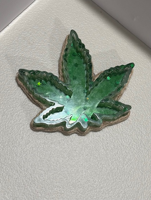 Shaped like a cannabis leaf and packed with sparkle, this resin piece is a playful yet practical ashtray.
