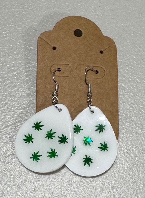 A twist on a classic shape, these glossy white teardrops are flecked with shimmering green cannabis leaves.